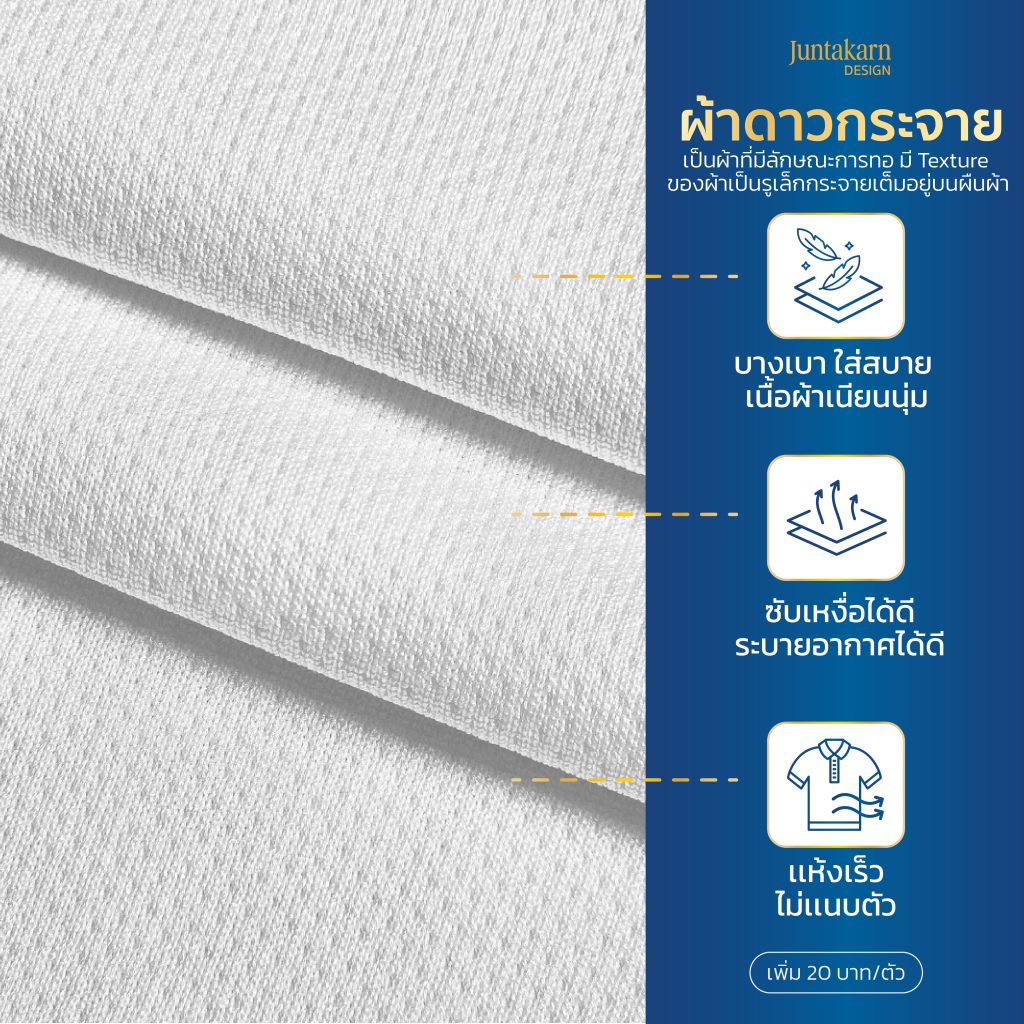 เนื้อผ้าผลิตจากเส้นใย Micro Polyester เกรดพรีเมียม ผิวสัมผัสนุ่มลื่น ไม่ยับ ไม่ย้วย ไม่ติดขน สวมใส่สบาย ระบายอากาศได้ดี ช่วยให้ลายเสื้อคมชัด